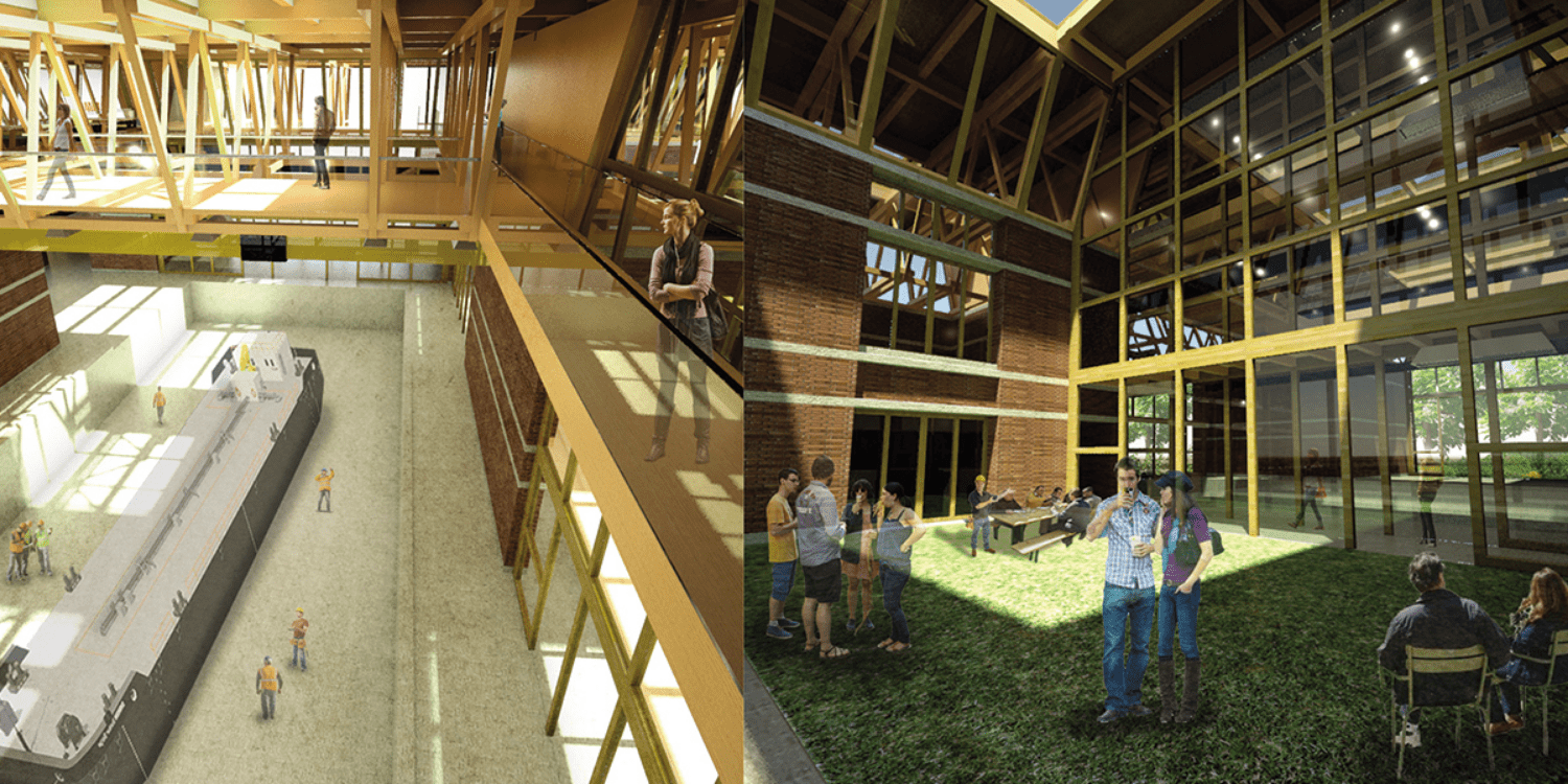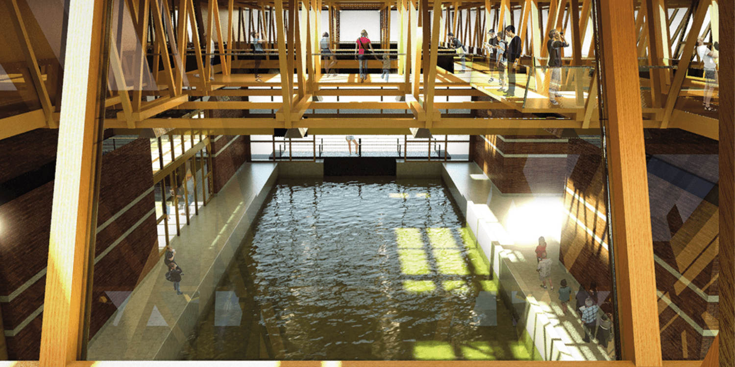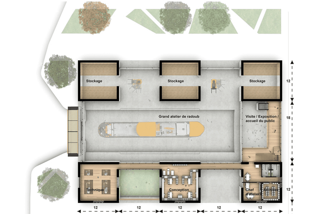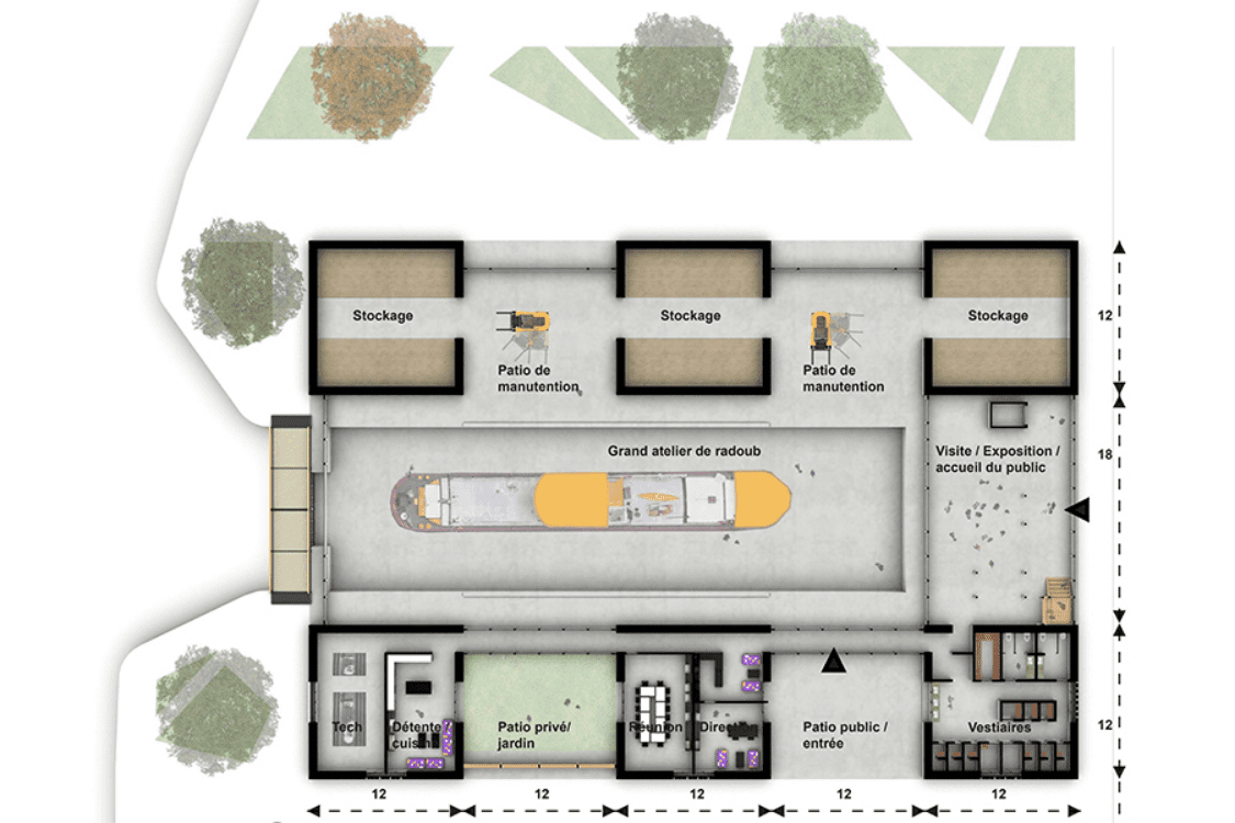 Le grand atelier de radoub occupe le cœur du projet. Il est constitué d’un bassin de radoub pour la construction navale, espace où sont fabriquées et entretenues les bateaux.