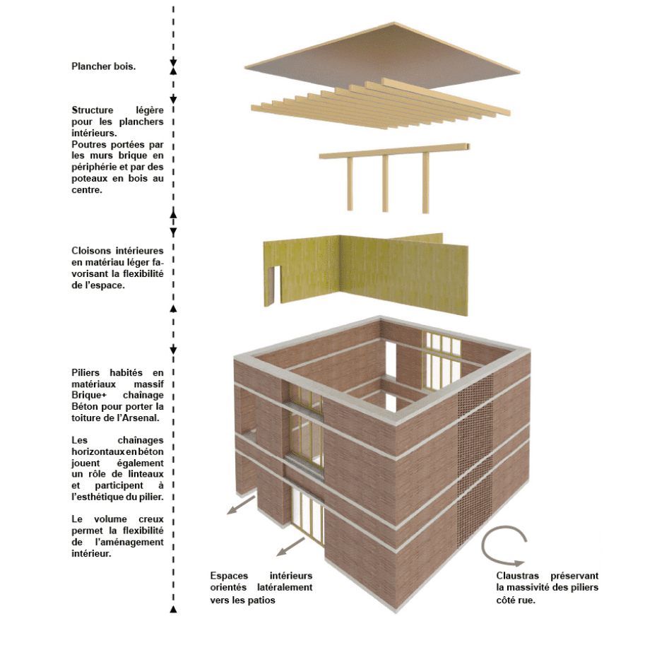 Les piliers habités hébergent les espaces de bureaux, d’ateliers et de stockage. Ils permettent de libérer l’espace entre les points porteurs pour faire circuler les énergies diverses, faisant vivre le chantier et ouvrant l’arsenal sur la ville.