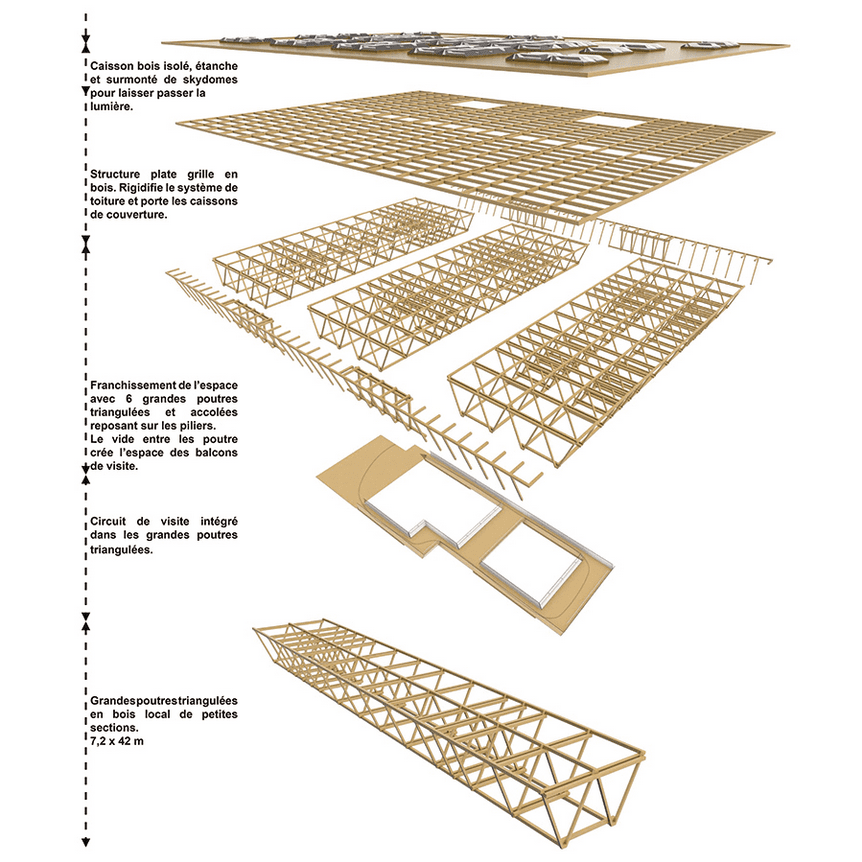La toiture visitée cumule plusieurs rôles : Faire visiter les chantiers, couvrir et éclairer les espaces et irriguer le bâtiment en terme de réseaux nécessaires à son bon fonctionnement (fluides – électricité…etc).
