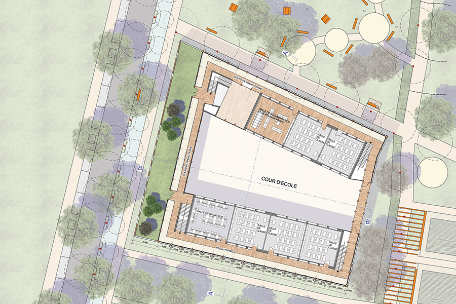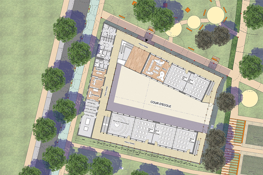 L’école se veut donc ici spatialement en rupture avec la ville. Elle s’articule derrière une peau protectrice, un filtre permettant de mettre à distance les lieux d’apprentissage que sont les salles de classes, et le lieu de vie en commun que constitue la cour.