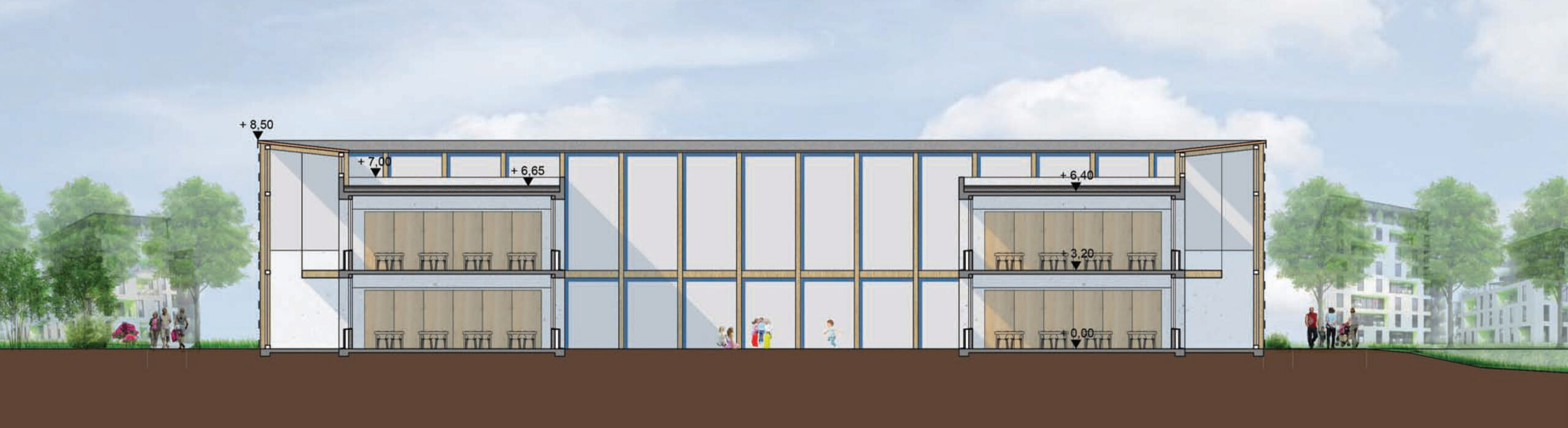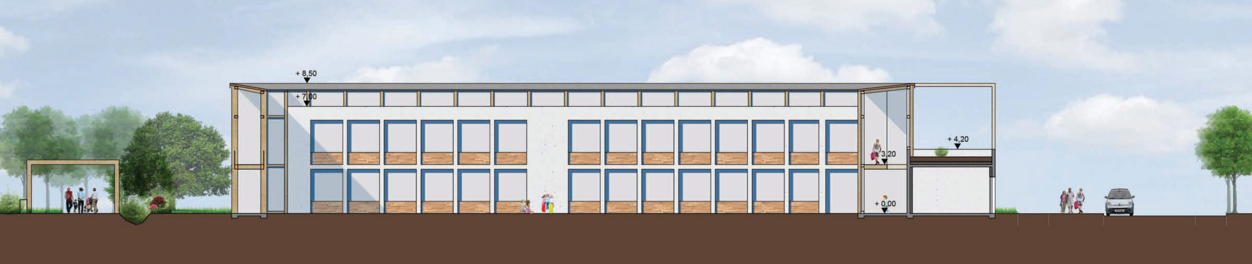Les espaces et les matériaux mis en œuvre mêlent des teintes d’enduits clairs et de bois, afin de proposer une ambiance chaleureuse et calme propice à l’apprentissage des enfants. Un espace clos pour apprendre et se recentrer, ouvert sur le ciel et les éléments naturels. Tel est l’esprit dans lequel a été pensé ce projet, au service des citoyens de demain !