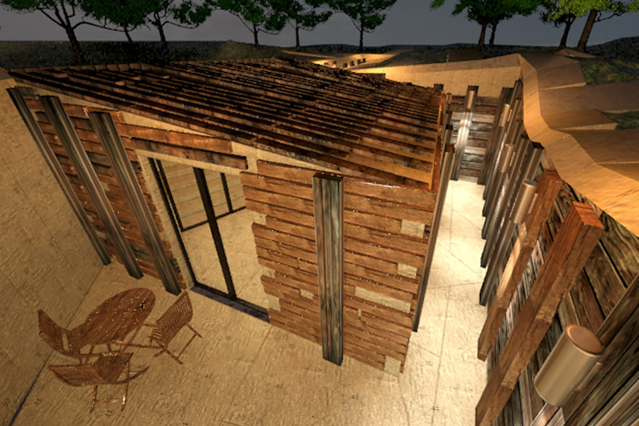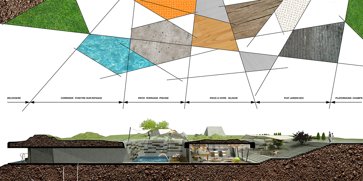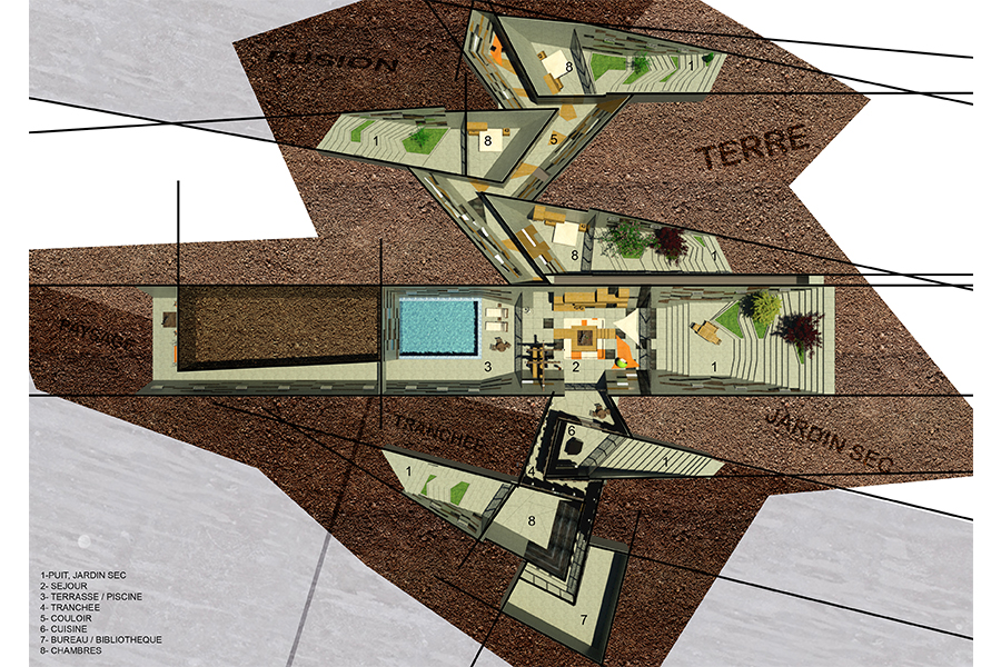Par son rapport particulier à la terre, la maison profite des qualités thermiques et environnementales que procure l’enfouissement dans le sol.